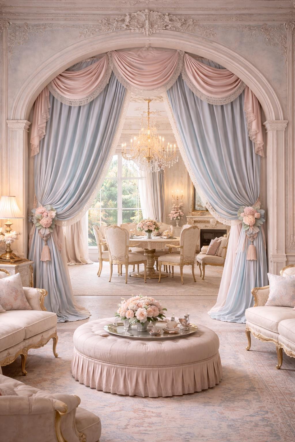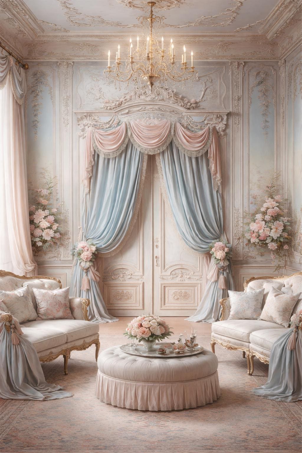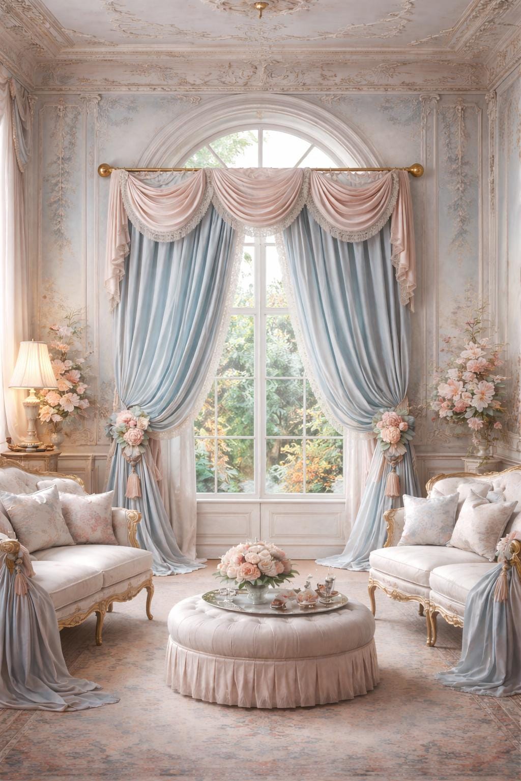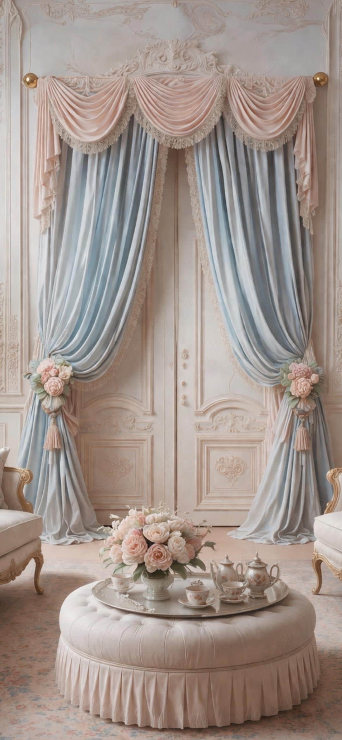 The ensemble features a dramatic, delicately draped pink georgette valance trimmed with lace, paired with two side ruffles in light blue georgette, also embellished with the same lace. The ensemble is completed by two decorative floral ambers, which enhance the soft drape of the fabric and bring harmony to the entire room.