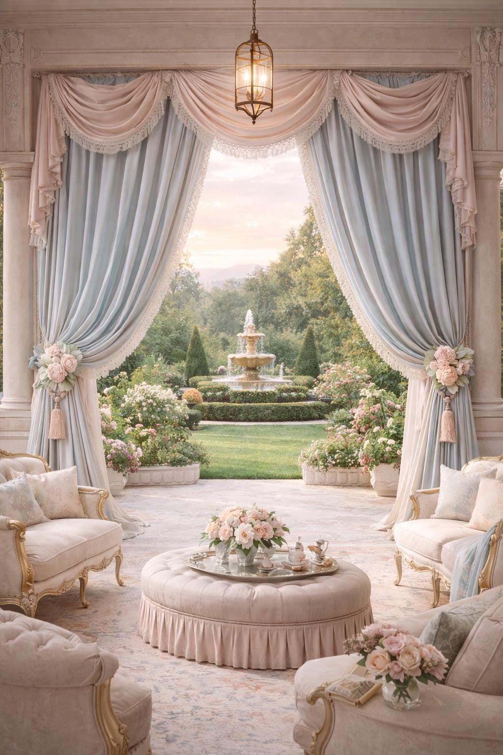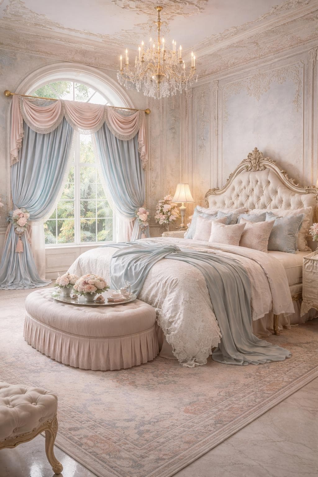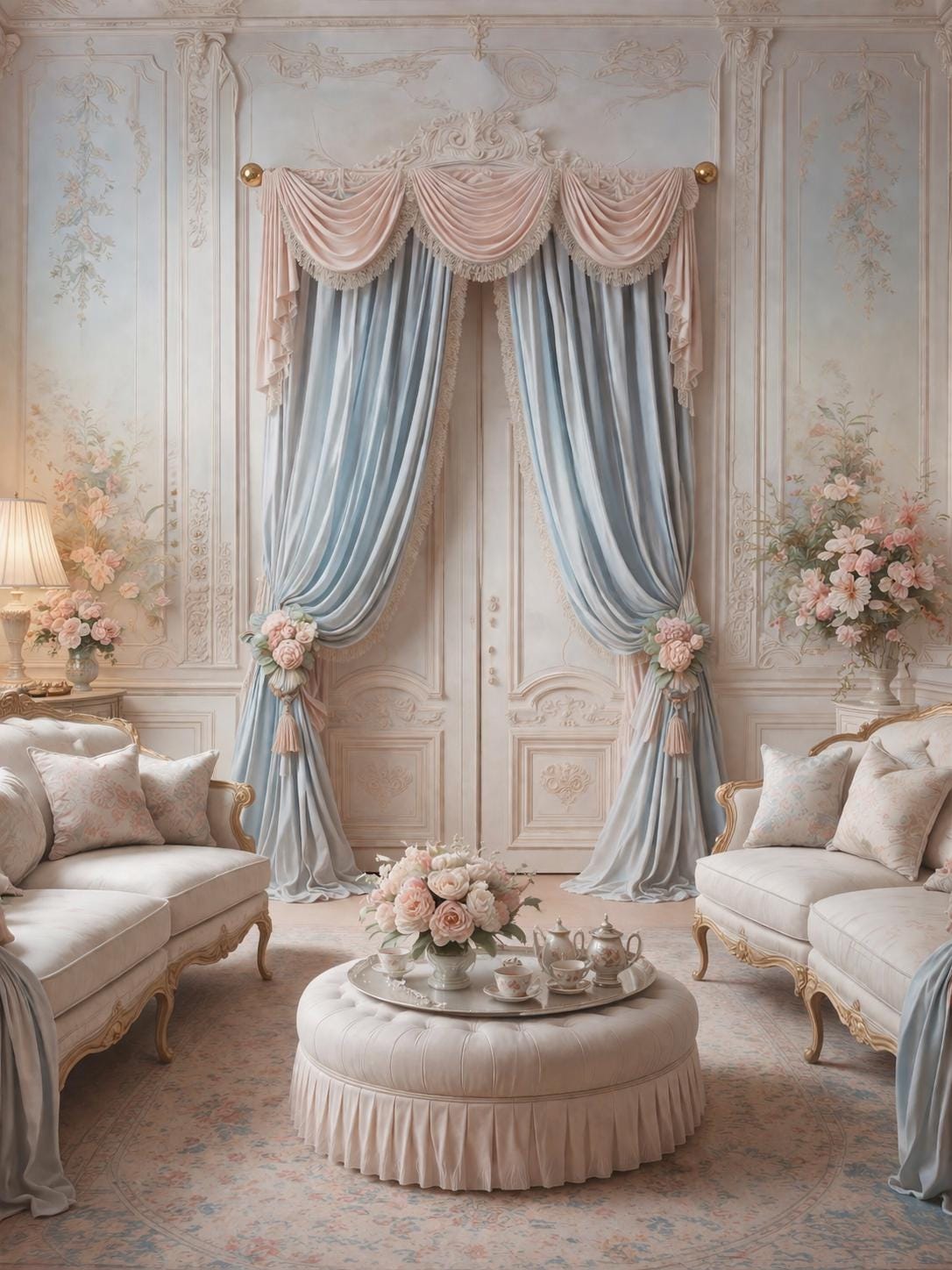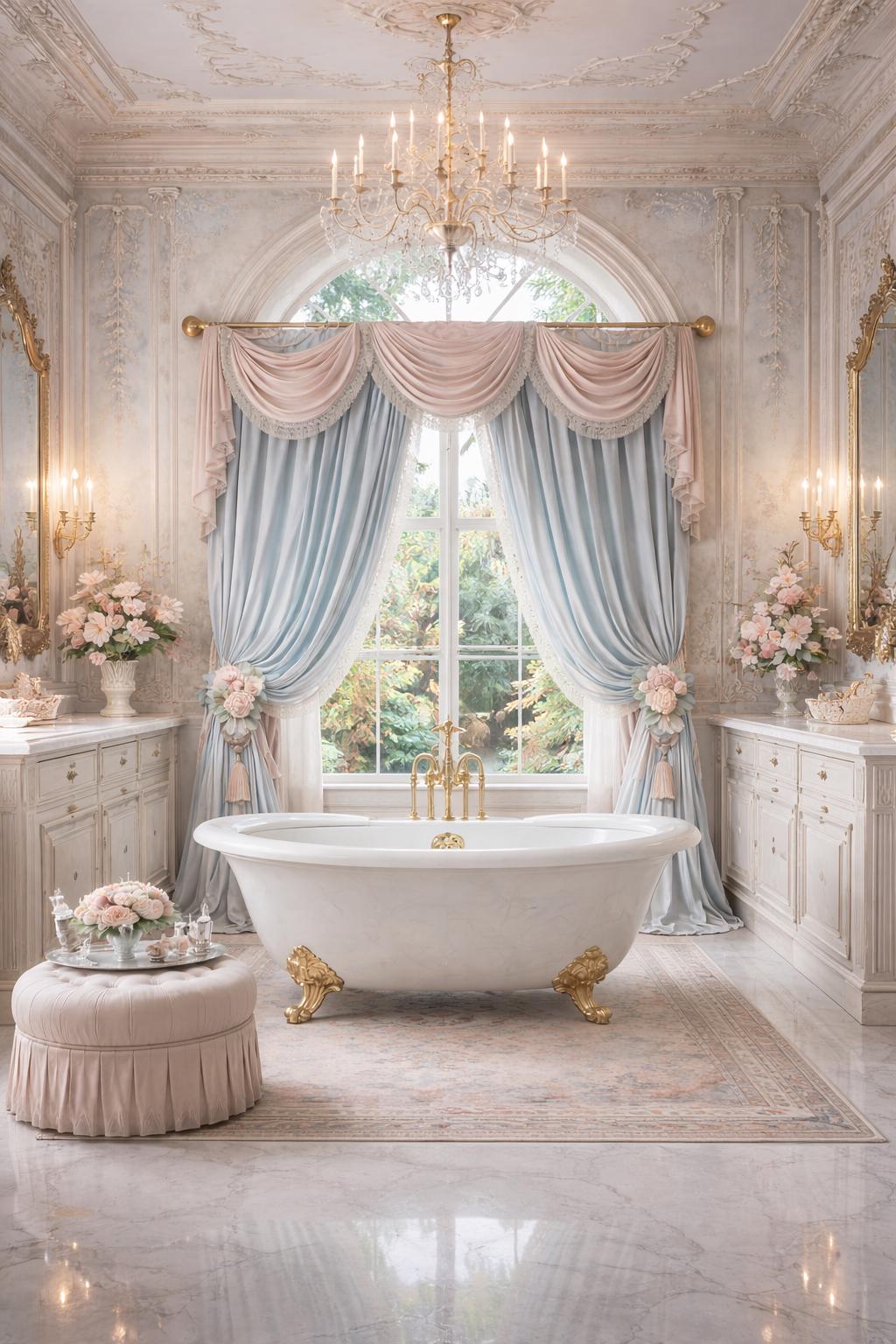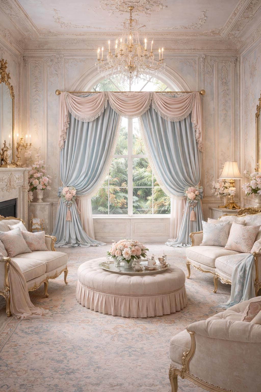The ensemble features a dramatic, delicately draped pink georgette valance trimmed with lace, paired with two side ruffles in light blue georgette, also embellished with the same lace. The ensemble is completed by two decorative floral ambers, which enhance the soft drape of the fabric and bring harmony to the entire room.