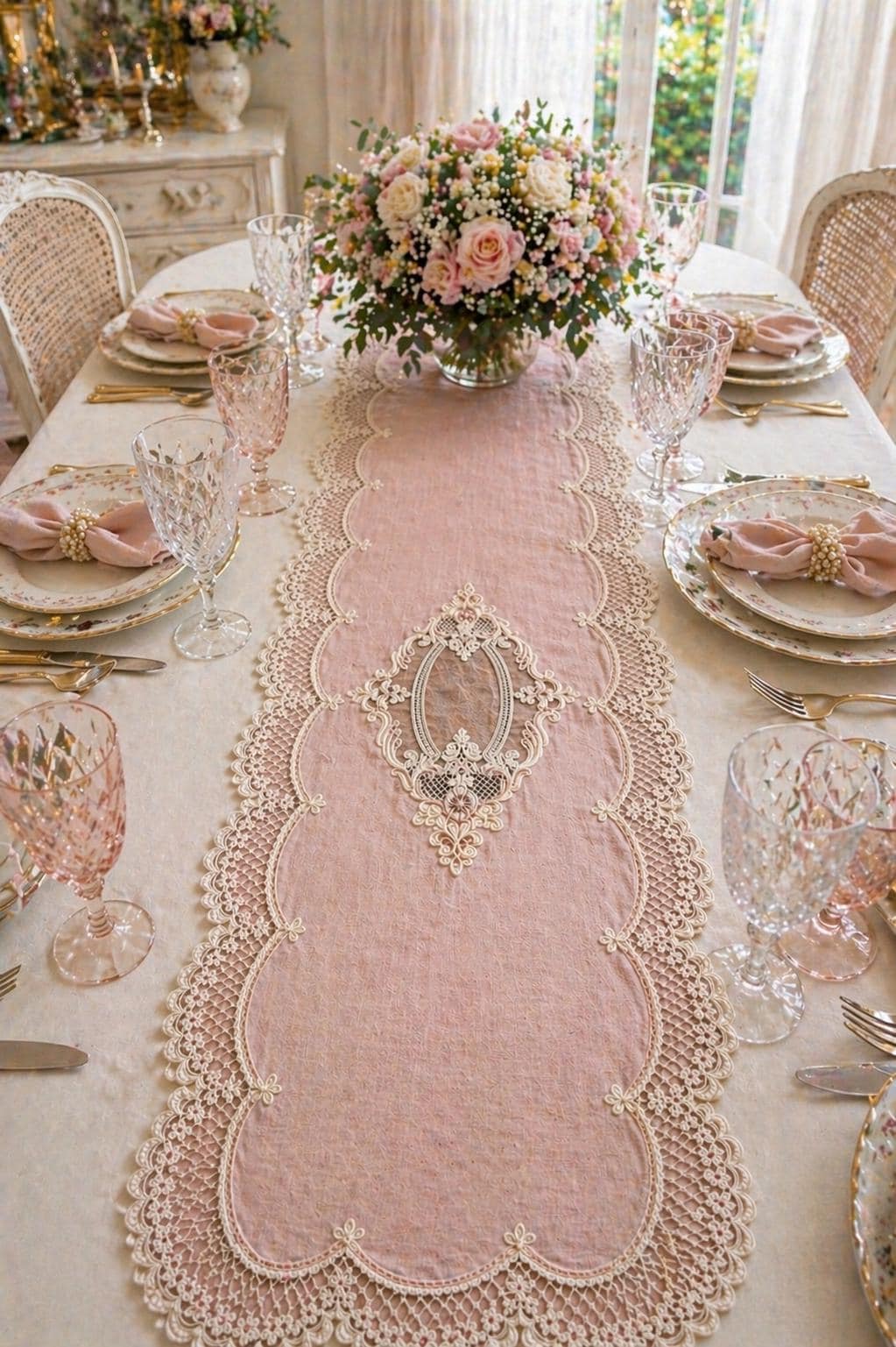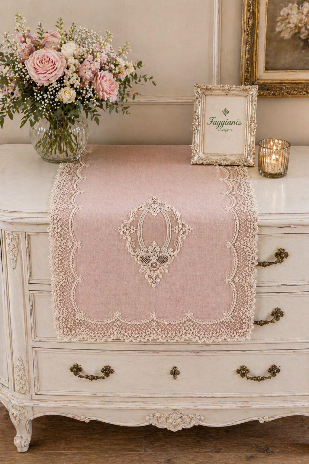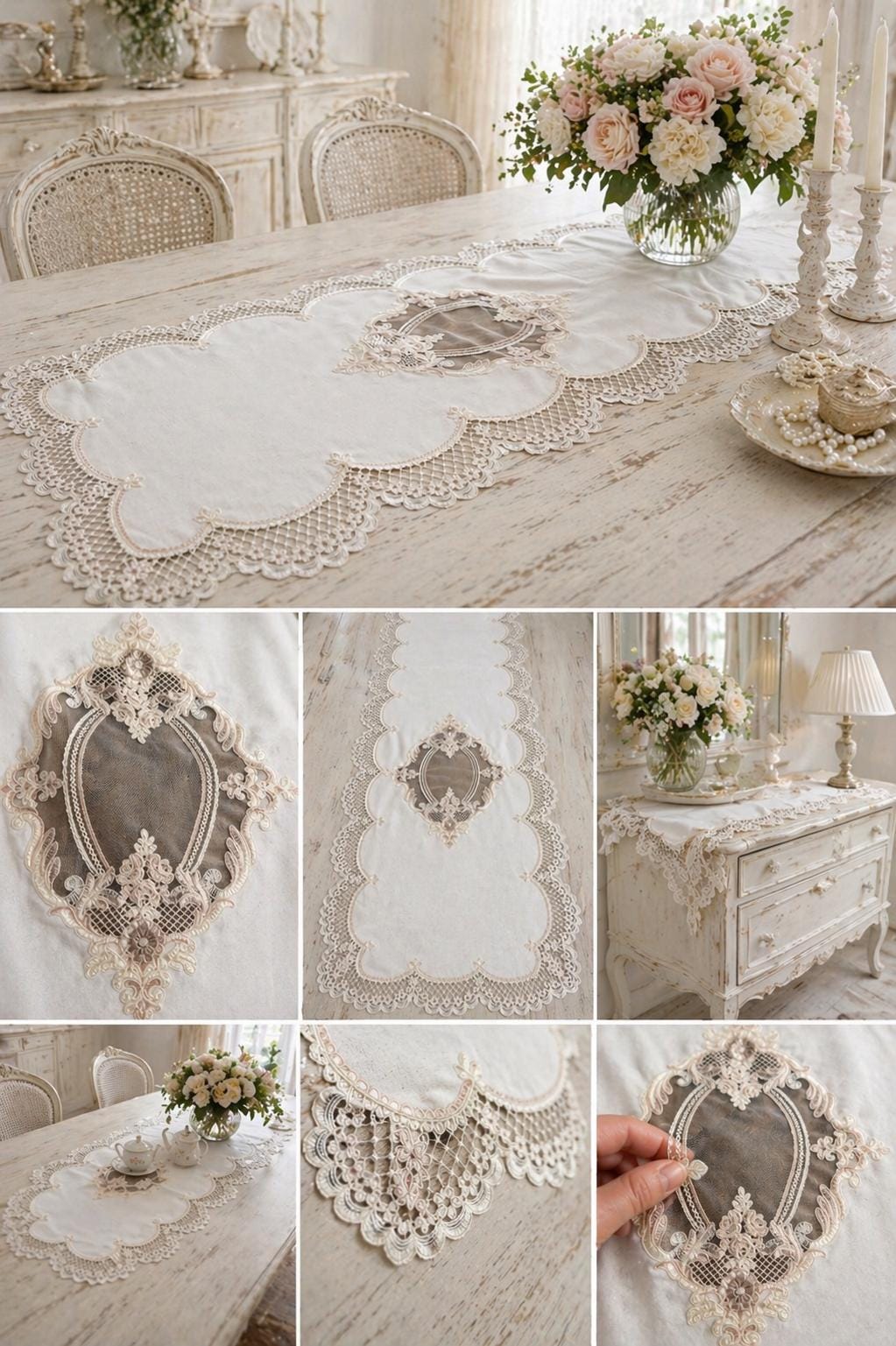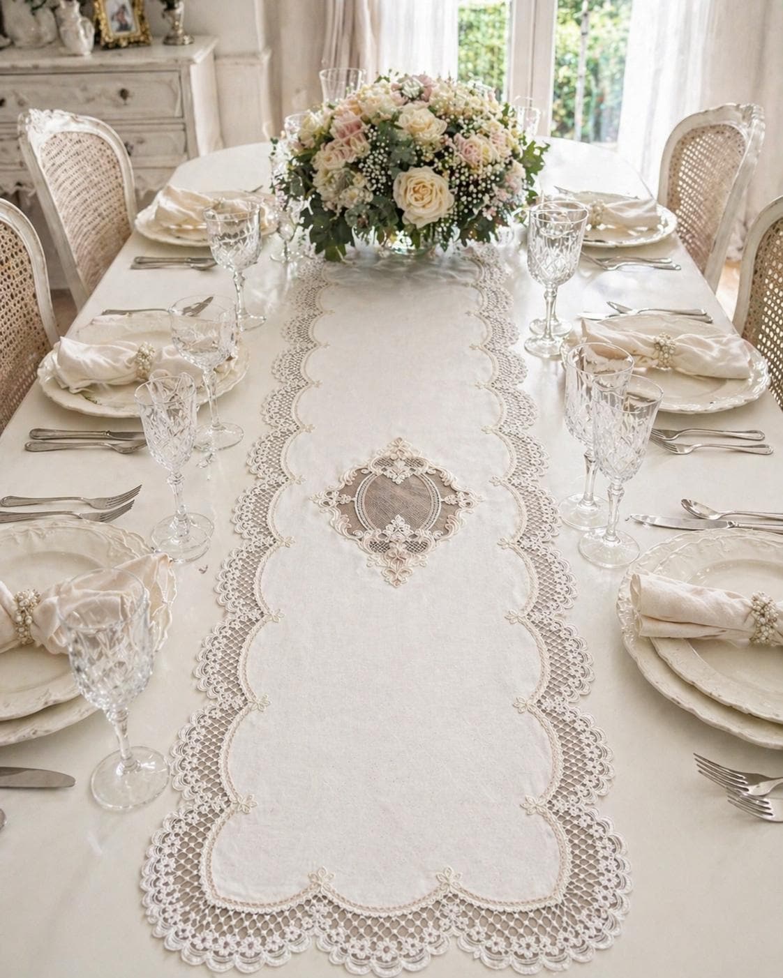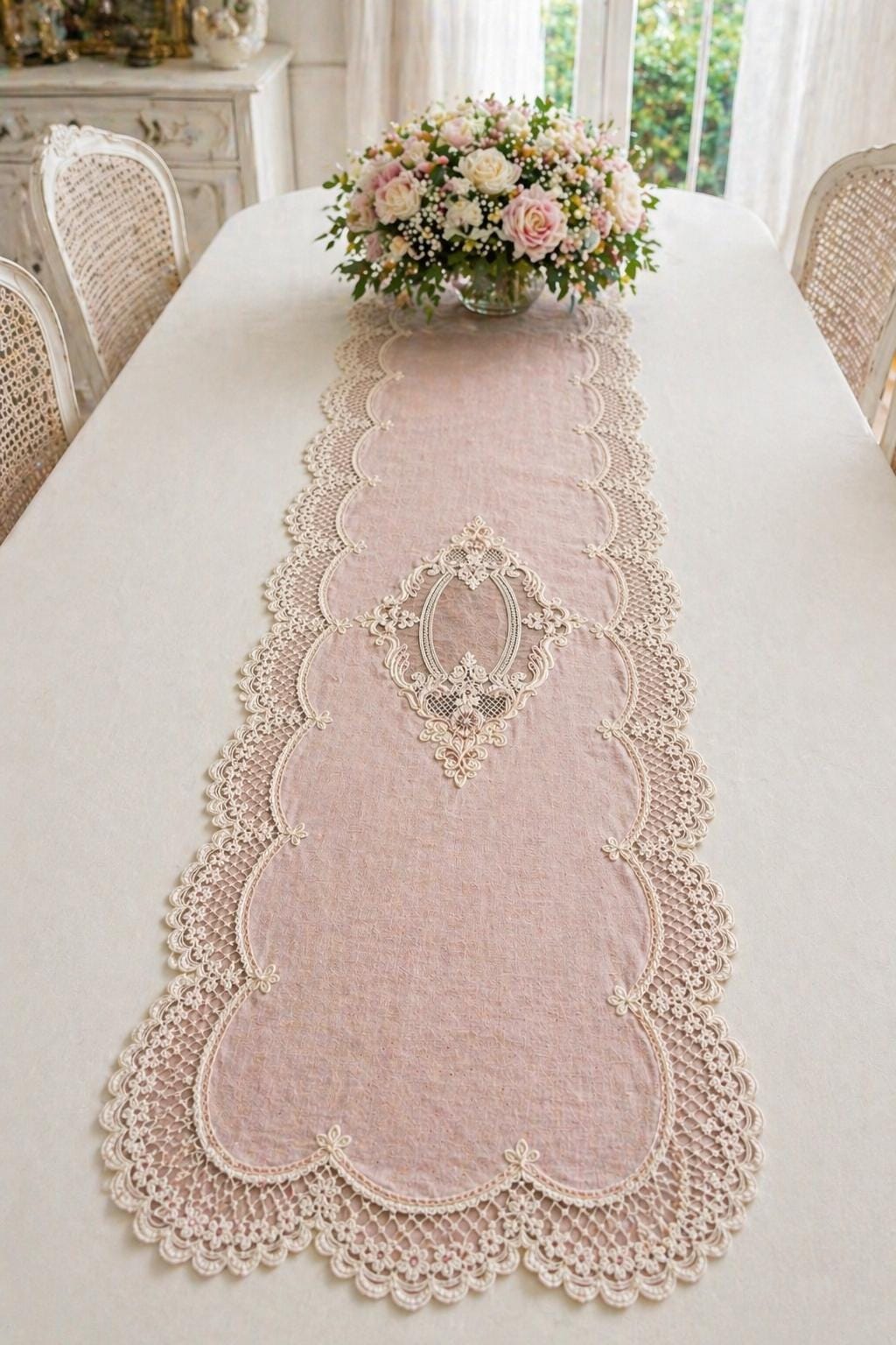 This runner is extremely versatile and adapts to a variety of uses. It can be placed on bare tables to enhance the natural beauty of linen, or over a tablecloth to create a more refined tablescape. It's also perfect on sideboards, dressers, console tables, or entryway tables, adding a romantic and elegant touch to any space.