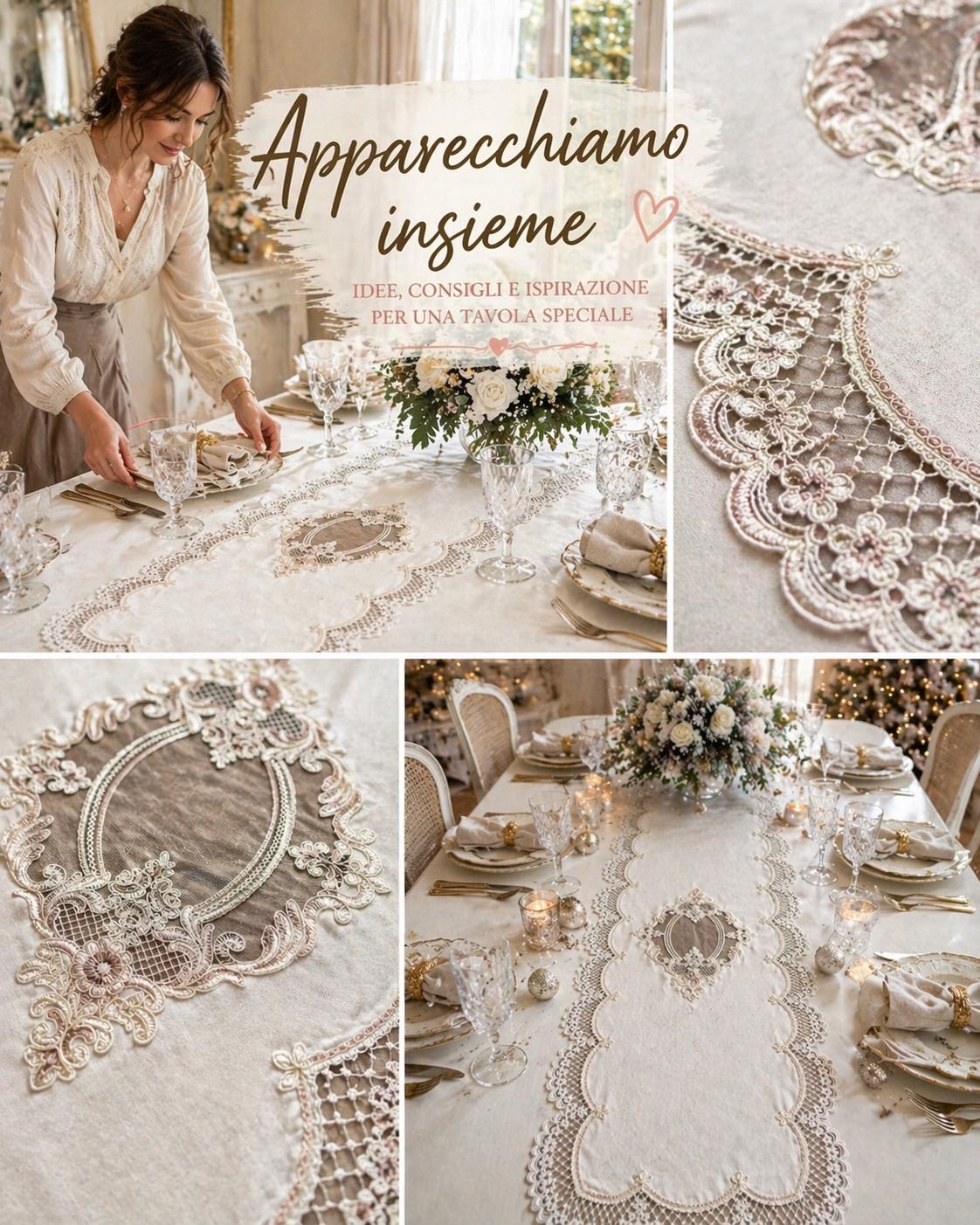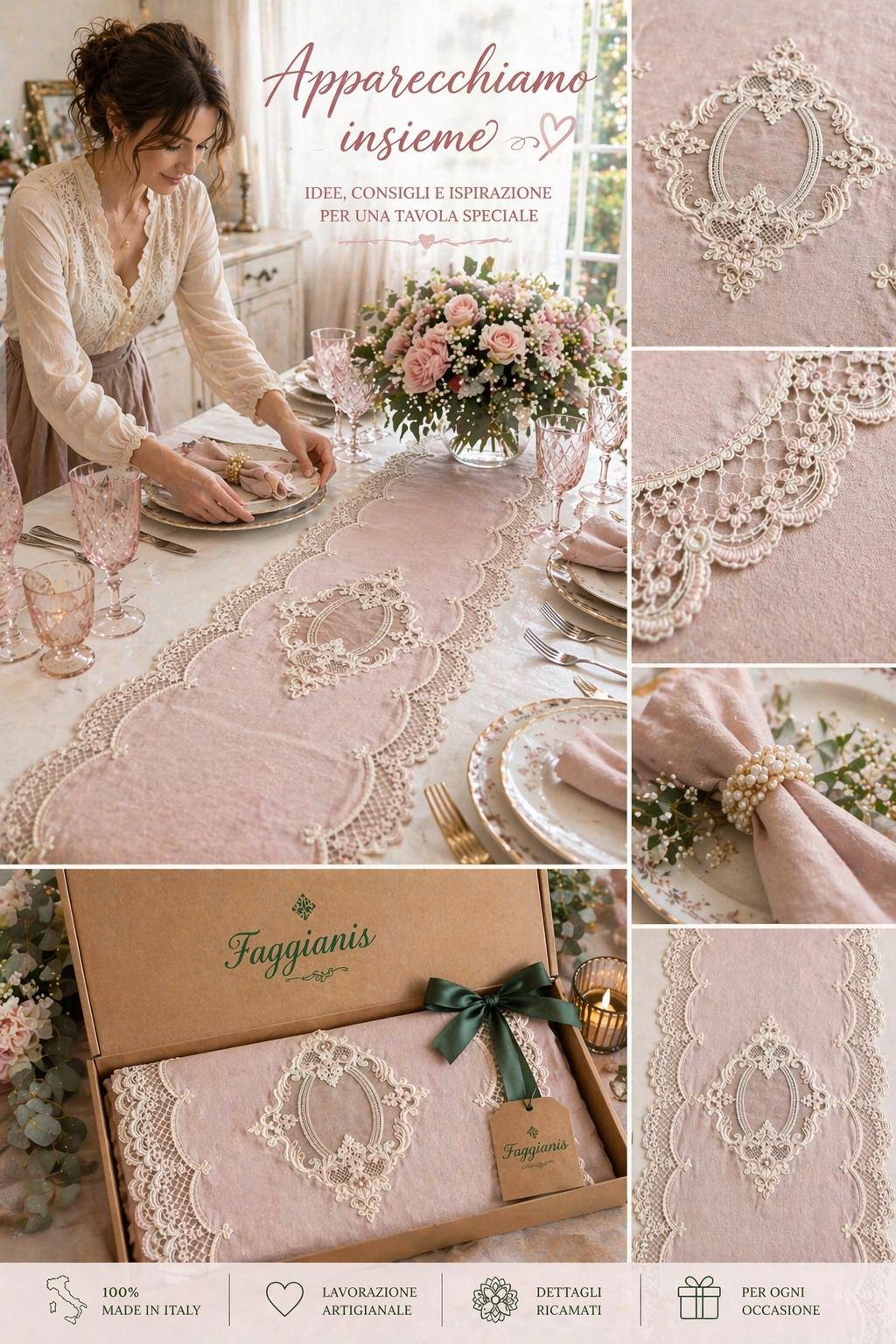 white linen with lace and beige tablò enriched with light gold threads, or powder pink linen with beige lace and beige tablò with thin pink threads.