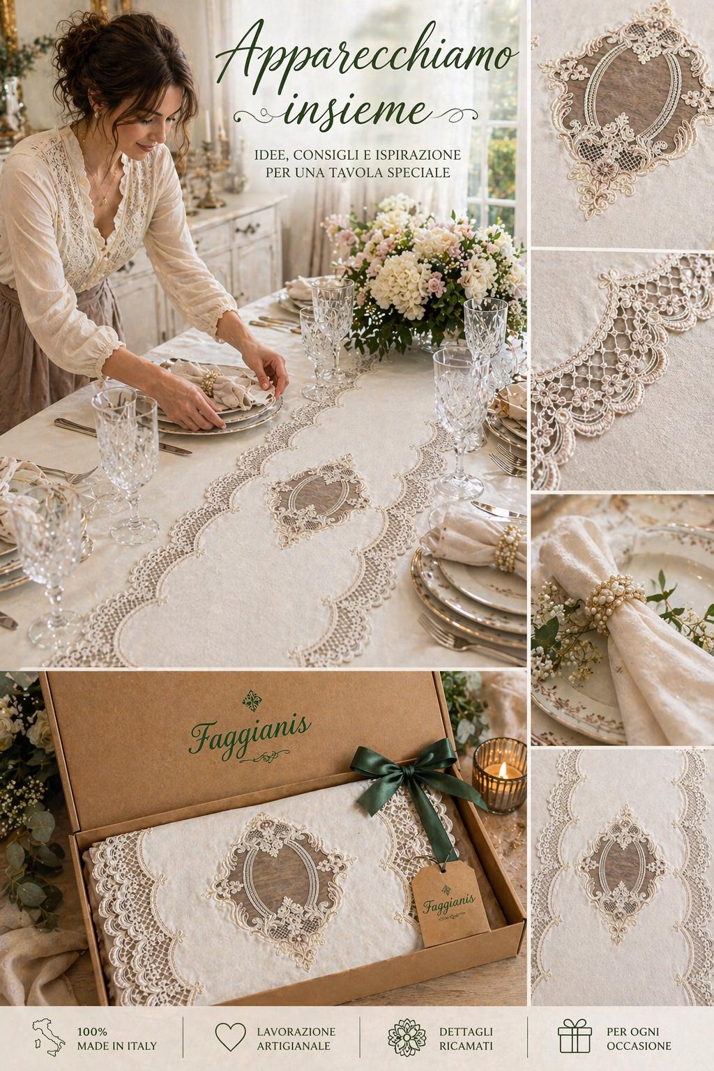 Table runner made of pure stonewashed linen, a washed linen with a soft, natural, and slightly worn feel, perfect for those seeking an elegant yet authentic table setting. The design is embellished with a refined lace trim along the entire perimeter and a decorative central tablò with delicate, tone-on-tone highlights.