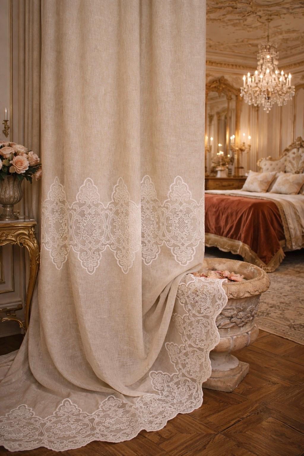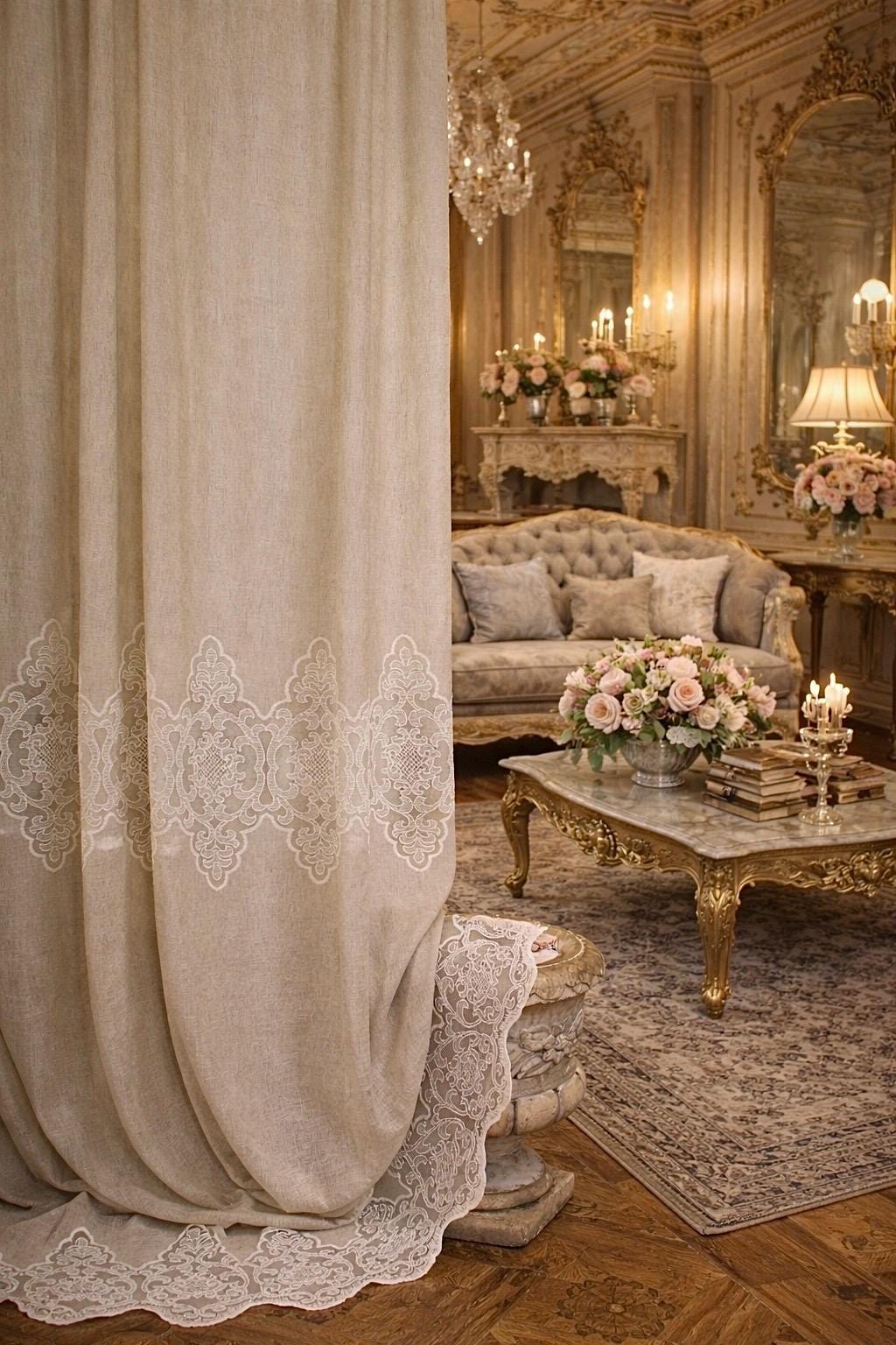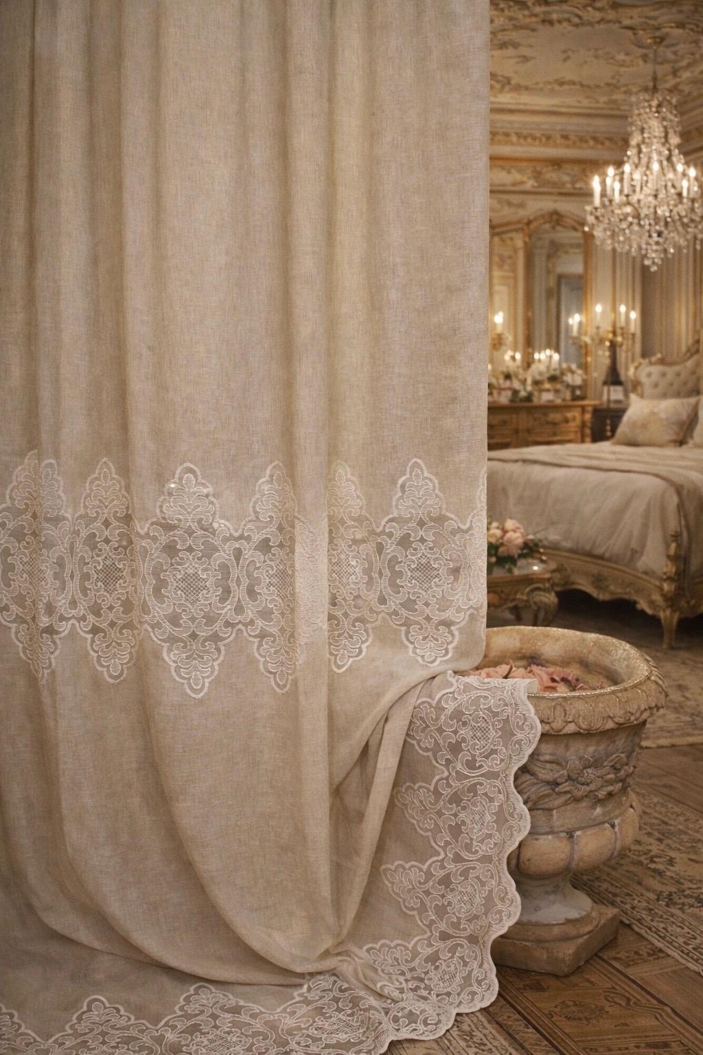 Linen and lace blend curtains for elegant interiors, with an impalpable refinement, light and romantic, they fit harmoniously into any style of decor. The fabric is so delicate and soft that it transmits a feeling of well-being and serenity to those who observe it. They filter the light. LINEN BLEND, EVEN MACHINE WASHABLE WITHOUT SHRINKAGE. They have an 8 cm buttonhole at the top for inserting the rod, the price refers to 1 panel. The first measurement is the width, the second is the height. DO NOT HESITATE TO CONTACT US FOR ANY INFORMATION GIULIA FAGGIANI and for custom sizes