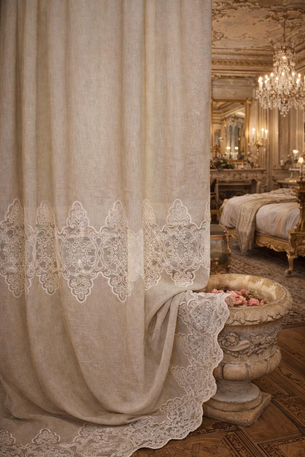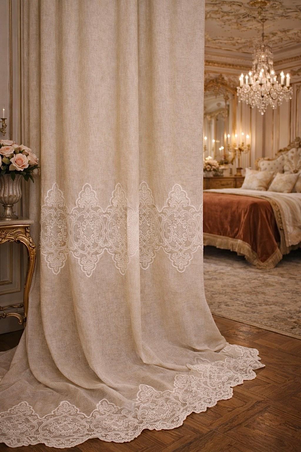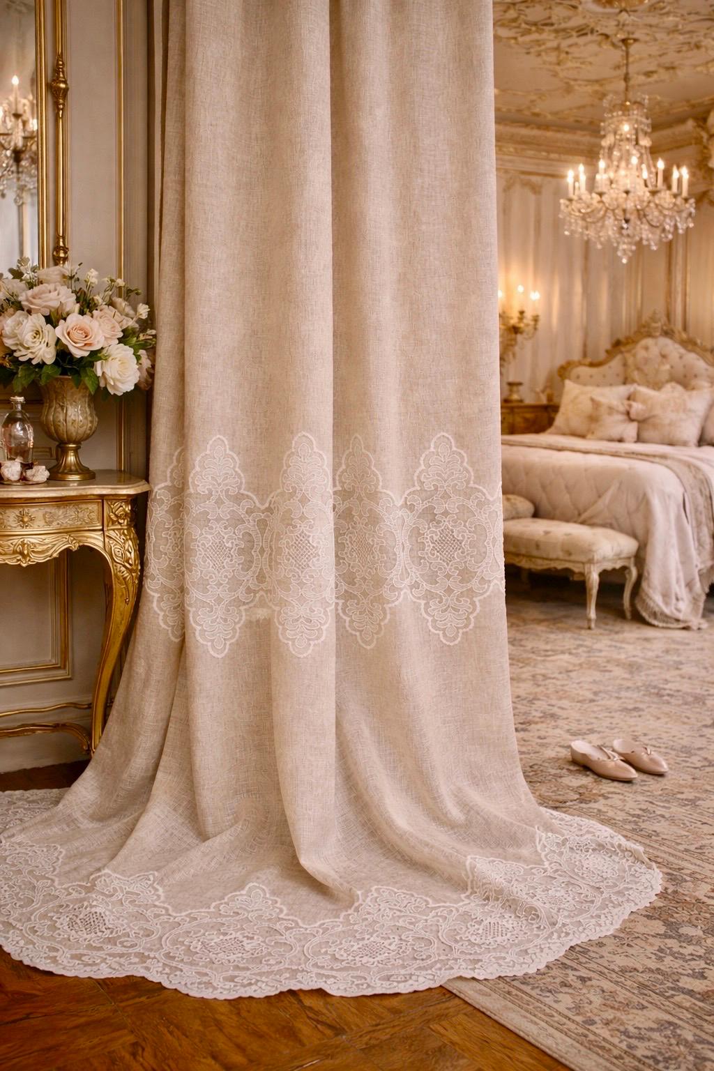 Linen and lace blend curtains for elegant interiors, with an impalpable refinement, light and romantic, they fit harmoniously into any style of decor. The fabric is so delicate and soft that it transmits a feeling of well-being and serenity to those who observe it. They filter the light. LINEN BLEND, EVEN MACHINE WASHABLE WITHOUT SHRINKAGE. They have an 8 cm buttonhole at the top for inserting the rod, the price refers to 1 panel. The first measurement is the width, the second is the height. DO NOT HESITATE TO CONTACT US FOR ANY INFORMATION GIULIA FAGGIANI and for custom sizes