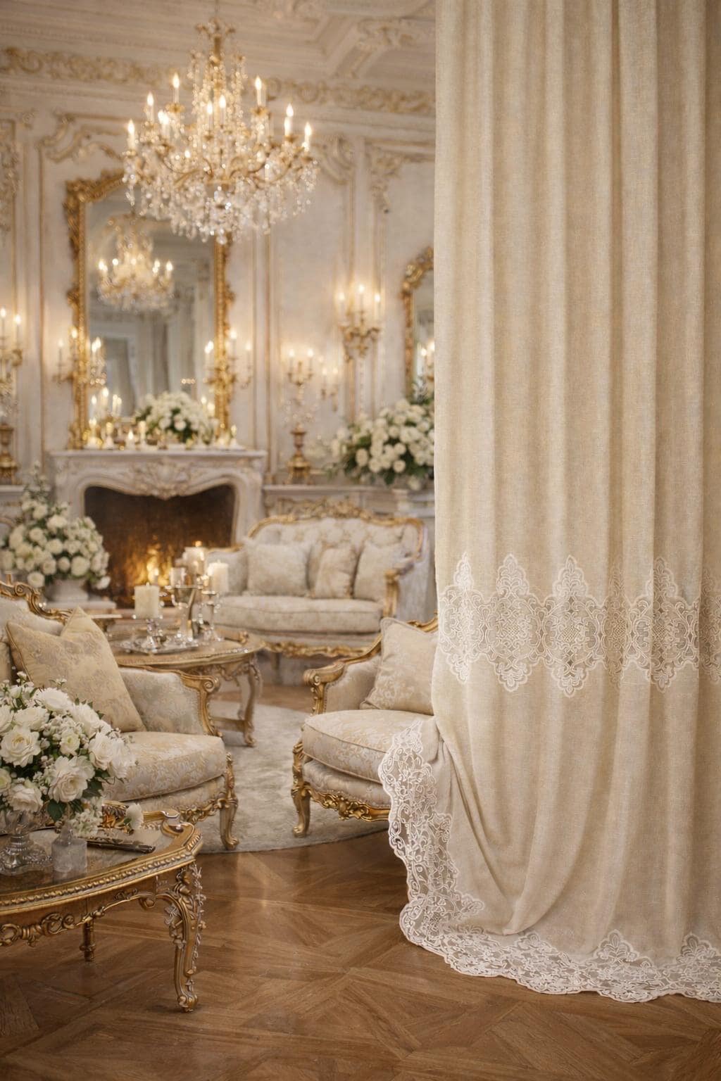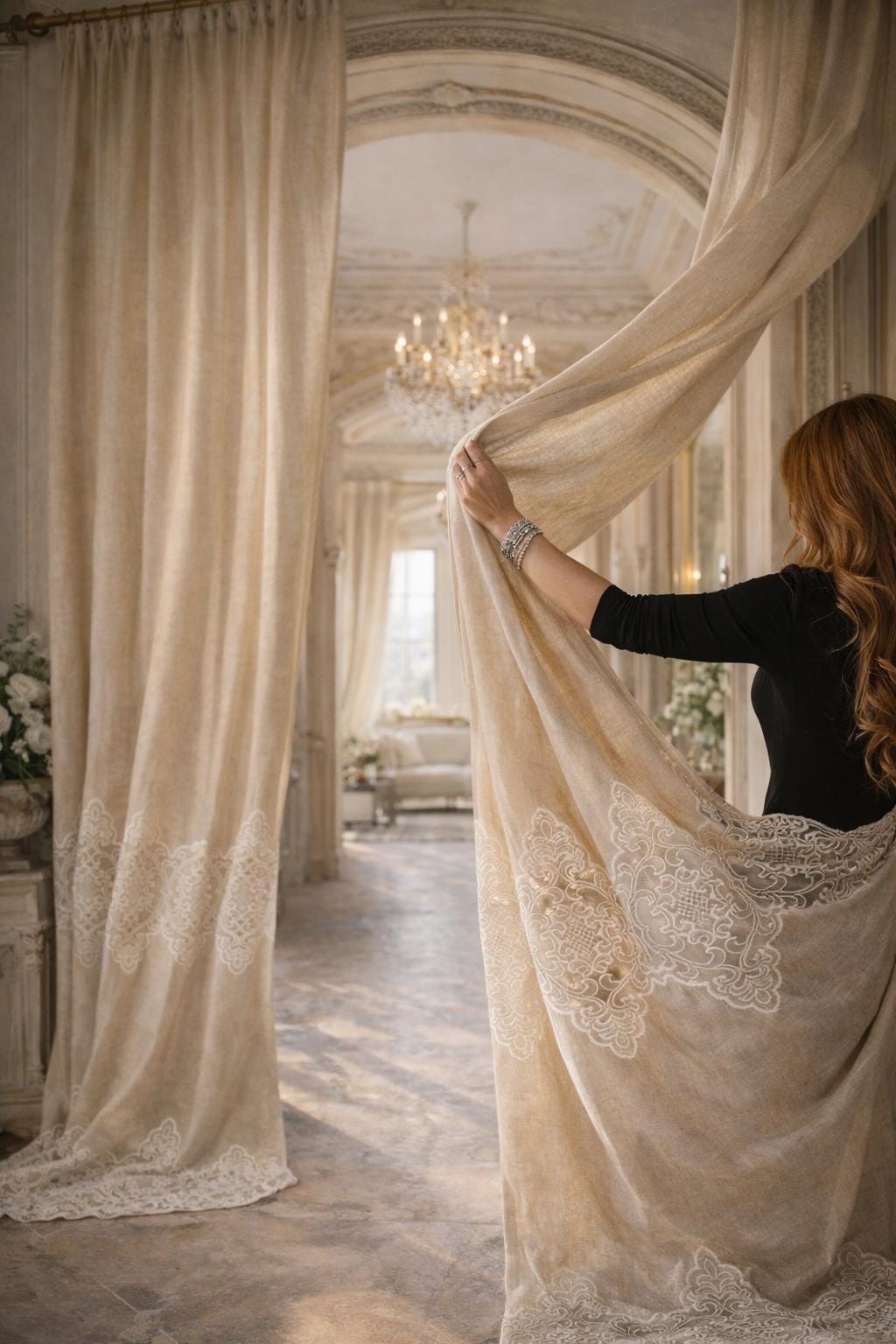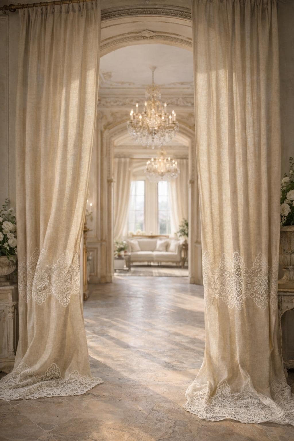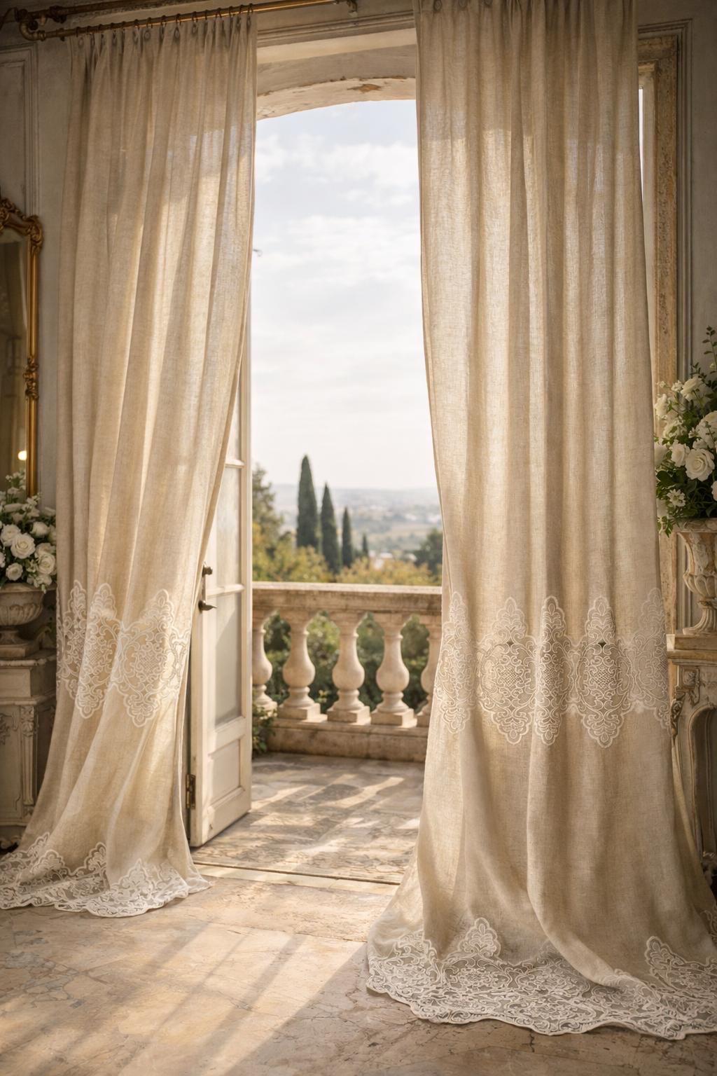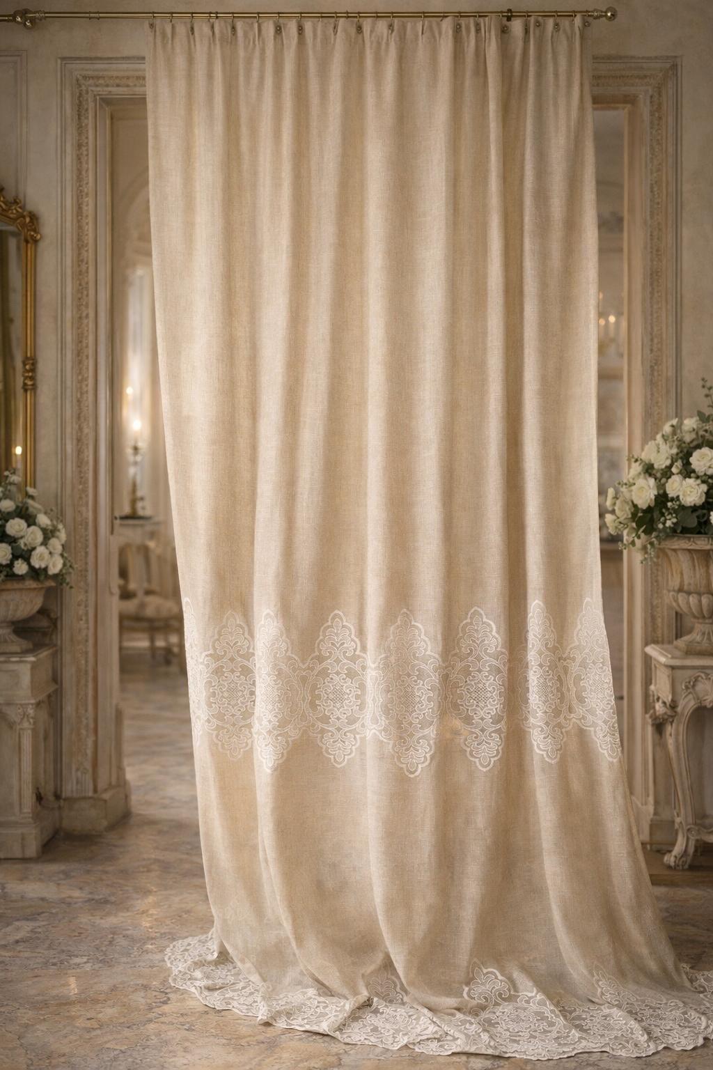 Linen and lace blend curtains for elegant interiors, with an impalpable refinement, light and romantic, they fit harmoniously into any style of decor. The fabric is so delicate and soft that it transmits a feeling of well-being and serenity to those who observe it. They filter the light. LINEN BLEND, EVEN MACHINE WASHABLE WITHOUT SHRINKAGE. They have an 8 cm buttonhole at the top for inserting the rod, the price refers to 1 panel. The first measurement is the width, the second is the height. DO NOT HESITATE TO CONTACT US FOR ANY INFORMATION GIULIA FAGGIANI and for custom sizes