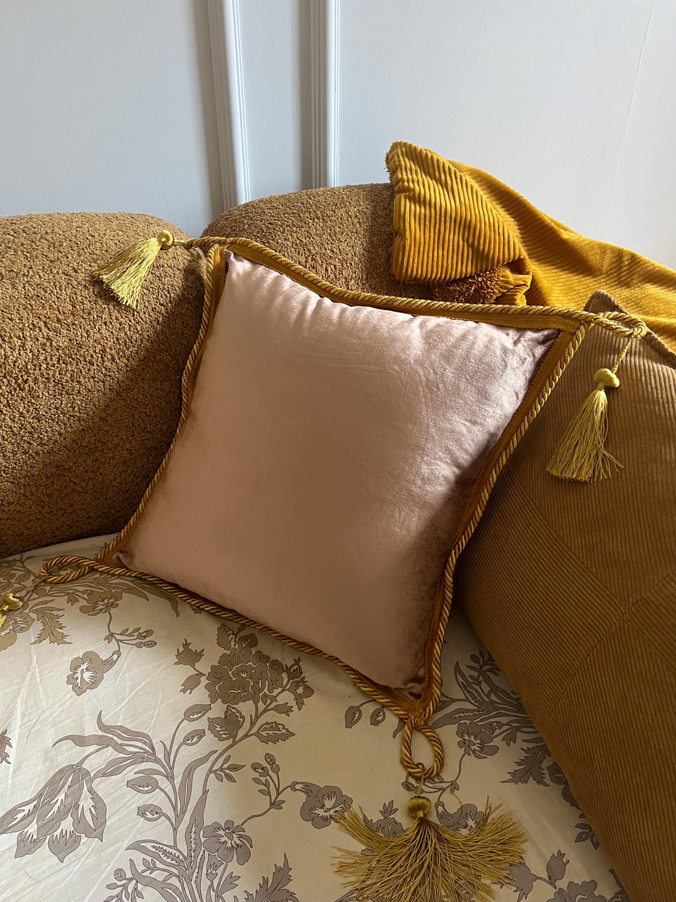 Cushion in fine velvet and antique bright gold trimmings, for a rich and sophisticated yet understated and chic home.