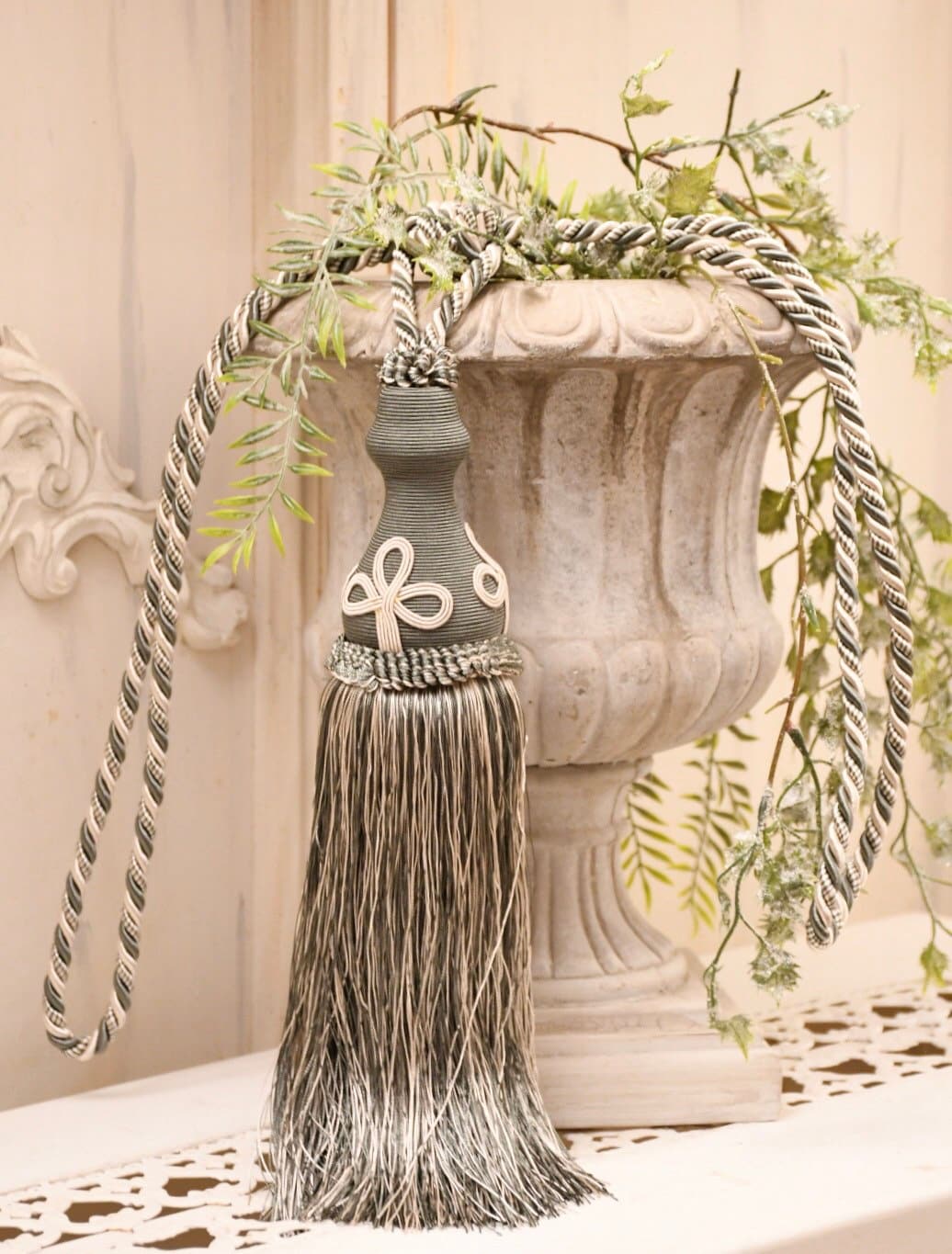 Refined curtain tieback in sage green and sage green/white.